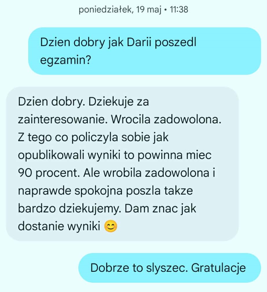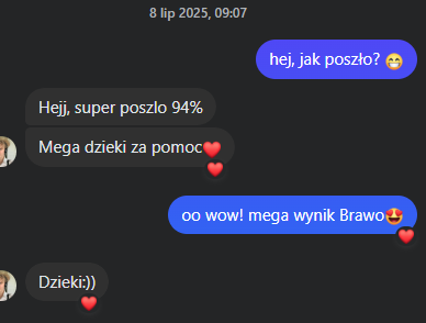 b) Przepracowanie kursu: Klient zapoznał się z co najmniej 90% materiałów dostępnych w Kursie (obejrzał lekcje wideo, wykonał zadania) przed datą egzaminu maturalnego. Weryfikacja aktywności odbywa się automatycznie na podstawie logów systemowych platformy kursowej Sprzedawcy.
