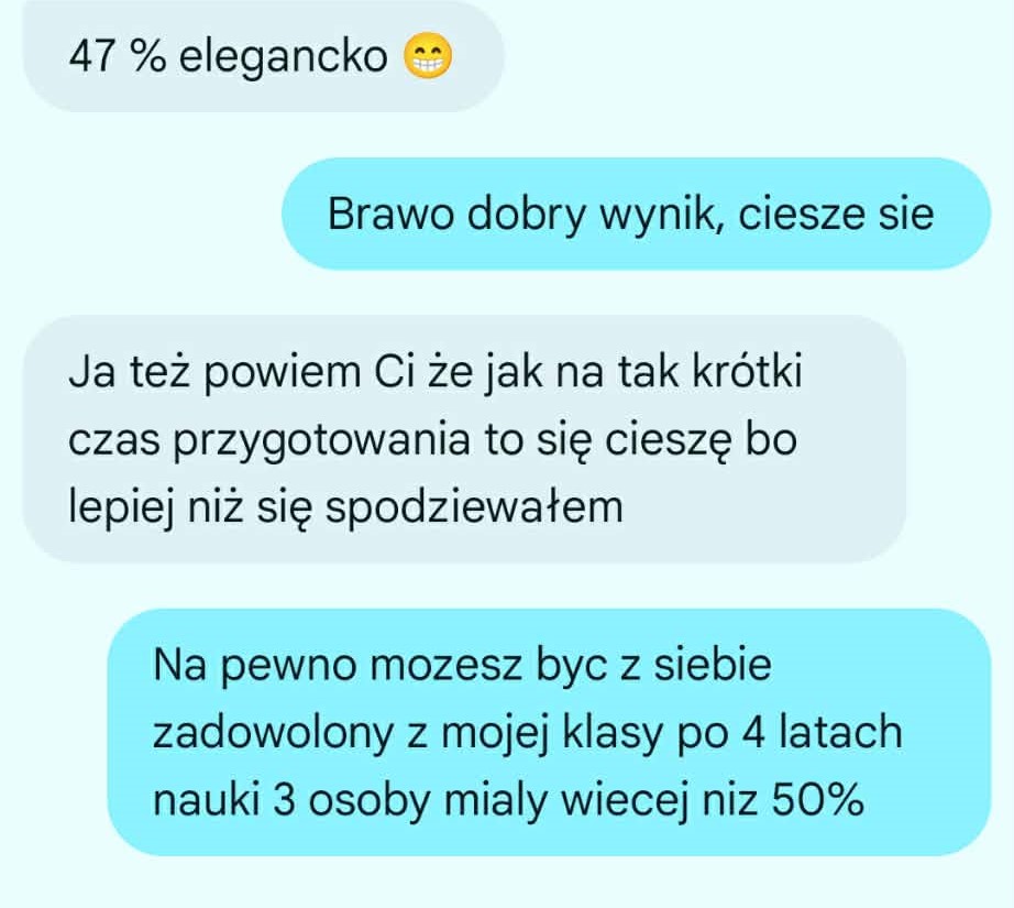c) Wynik egzaminu: Klient uzyskał wynik poniżej 30% w oficjalnym terminie maturalnym.